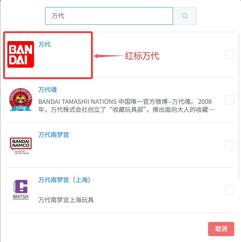 注意:例如万代需注意区分红标和蓝标(目前大部分新品为蓝标,食玩、超可动和掌动等系列为红标,同时收录/修改旧产品注意关联红标)