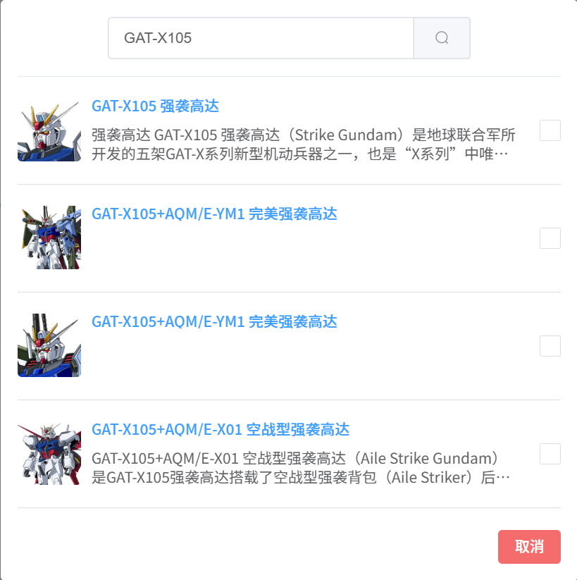 3.角色:关联角色信息,同一机体的不同形态(例如强袭高达)视为独立角色。搜索按照机体编号查找,编号查找不到则为该机体还未收录,新增机体词条后添加关联