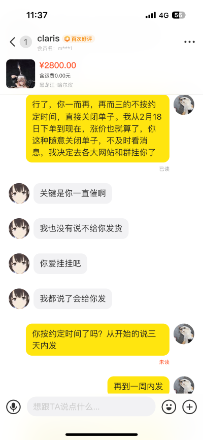 <html> <head></head> <body> 该卖家的恶心操作如下:1.两次未按约定时间发货;2.消息经常已读不回;3.坐地起价;4.未经沟通直接关闭订单。(从2月18日到今天,足足浪费我一个多月的时间) </body> </html>