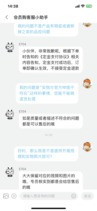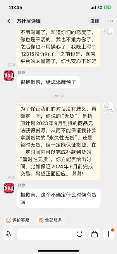 <html> <head></head> <body> 事件:第一批预定的单子被鸽,而且没有任何反制手段,很无语 时间线: 2023年6月,本人在tb“万社屋通贩”以20元定金预定taito的这个景品。 2023年9月-2024年1月8日,至少三次和店家确认到货和补款情况,每次都是告知到货延误,需要耐心等等。 2024年1月31日,最后一次询问到货情况,告知无货,店家打算退款了事。我本人玩手办很多,其实多一个不多少一个不少,20定金也不多,但被这种店家恶心到了,没货就一开始说清楚,别一直钓着,我不问就等于吃定金,问了几次才说没有,是真的没货了还是自己看价格涨上去当倒爷了?我一个人,这一次订单是20,那人多了,不限于这个手办的订单多了是不是构成一大笔金额,非法集资?不问不说,问的多了就“抱歉”,什么都用抱歉就别开店,上纲上线讲就是商业的不诚信,玩不起就别玩,我也刚上了,20不用你退,我诉求不是20的定金,我要的是原本订单说好的价格说好的货,给不了那我先tb平台加12315一波,手办买家各个都是冤大头是吗,被延期就算了,连店家都能耍花招不好好做买卖了? </body> </html>