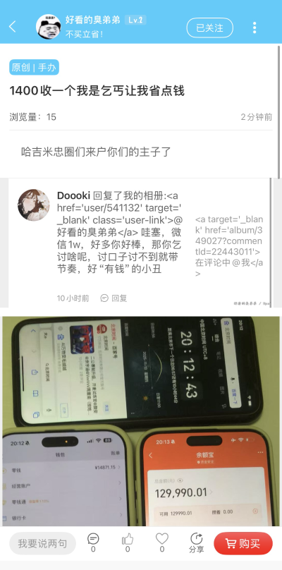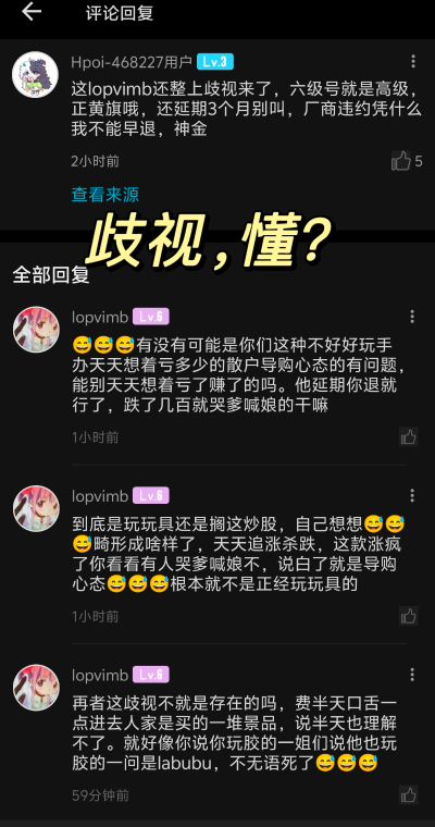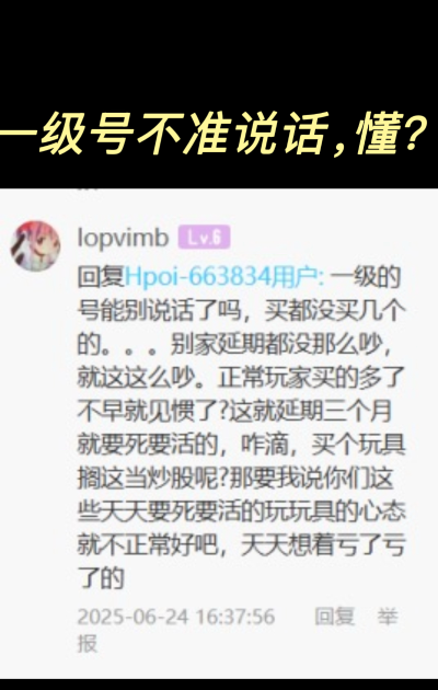 不是为了你好兄弟acg开帖喷我吗,我最多就是戾气大我认了我改改(麻烦善用屏蔽功能)。可宁@lopvimb这神人发言可太多了吧? 一级号不准发言,延期不准喷,喷延期就是孬种,预定亏了活该,顺手还乞讨一下,buff叠满咯。 快别给你好兄弟acg“贴脸大帝”撑腰了,一群神人