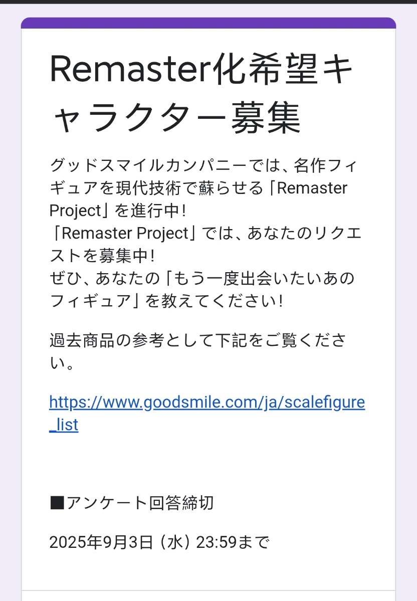 一次问卷可以写一款手办,可以多投多款 看起来是针对老物的再版,投票太新的款式可能不易被采纳 https://www.hpoi.net/outLink?urlId=6571