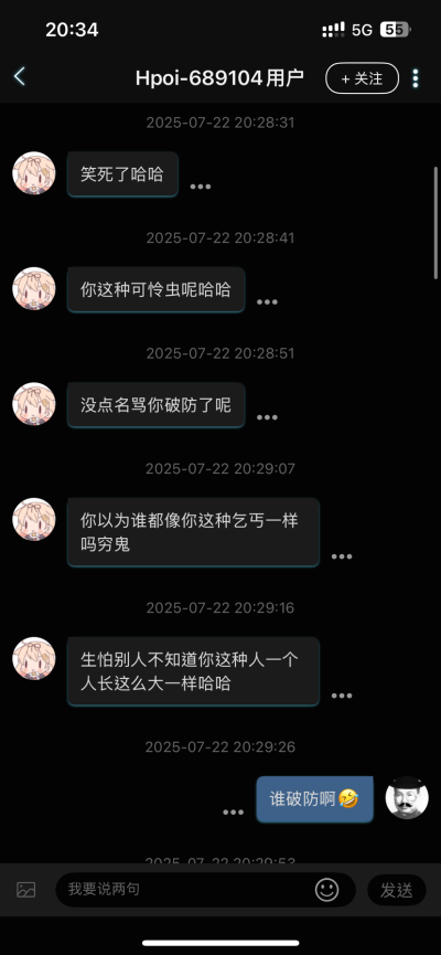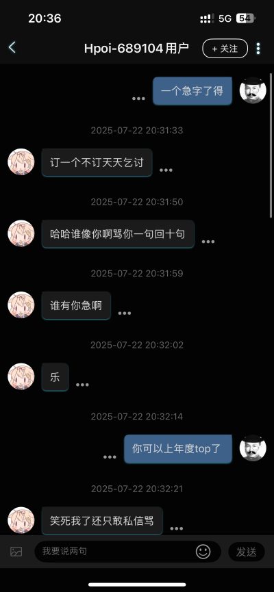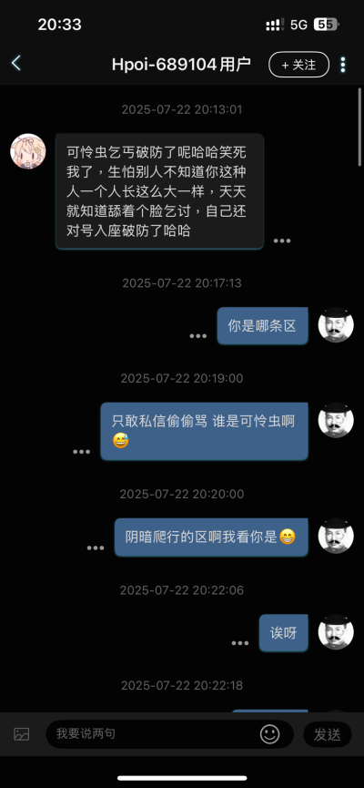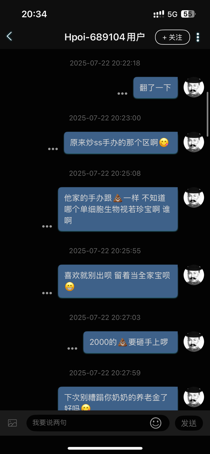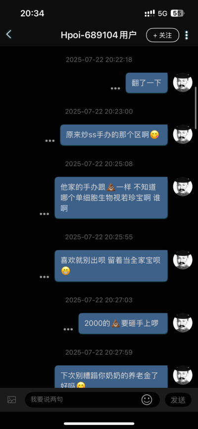 晚上看到一个人骂我 我寻思着也没惹啥人啊 点进主页一看 原来是ss孝子 上次说了句ss手办出必跌 给着b整急眼了 幸好截图的快 现在已经给我拉黑了 急死了