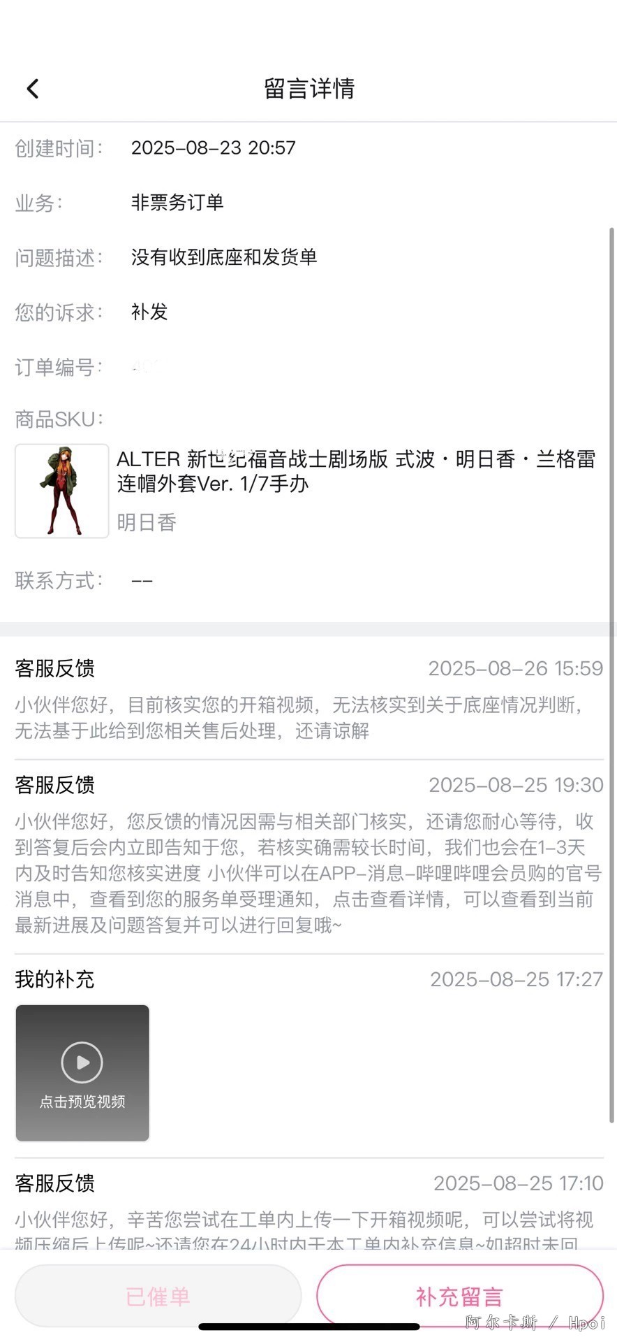 这个是之前明日香没有底座的后续,我的诉求是补发底座,但客服搞半天来一句无法核实关于底座的情况,我寻思这个底座是红色的,我的视频里面从开箱到拆除内塑盒子,里边什么时候出现过红色底座了,视频全程一镜到底,没有离开过盒子。一想到我大a的手办基本上都是B站定的,更是彻底释怀的笑了