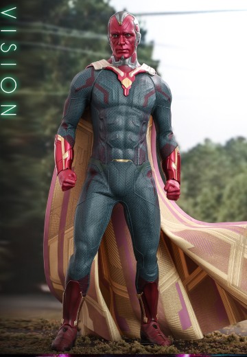 Hot Toys特别按角色比例塑造出高约31.5cm,拥有健硕身型的男性专用素体,全身逾30个可动关节,能摆出多款大幅度的姿势。Hot Toys参照保罗•贝坦尼所饰演幻视一角的面形轮廓精雕细刻,双眼透着银蓝光芒,金属紫色的皮肤象徵着他同时拥有超自然的生化及机械本质,当然还有额头上不可或缺的黄色心灵宝石。Hot Toys团队以细致无遗的剪裁技巧缝制出幻视的贴身战服,配用上蓝绿丶紫红及金色的夺目颜色,选用了具弹性与质感的布料剪裁缝制,并仔细以滴胶印上线条纹理,当战衣紧贴于具肌肉感的人偶素体上,除了能呈现出贴服流线的外观外,屈曲上身及摆放动作时,肌肉纹理亦可与紧身服同步连动及挤压,进一步令本来已超像真的人偶,变得更有生命力。人偶配合上一件以高质布料独特裁剪而成的斗篷,以多重丝印技术将精细复杂的条纹图案,让电视剧造型呈现到人偶身上。