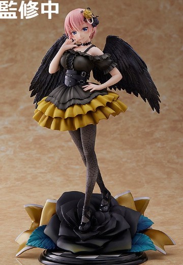 出自電視動畫《五等分的新娘∬》,長女「中野一花」化身為比例模型登場。將身穿以墮天使為形象服裝的特製插畫製成模型。手指放嘴邊的溫柔表情,柔和的動作令人印象深刻。荷葉邊的展開、染黑墮天使的翅膀與褲襪的花紋都細緻表現。台座配合墮天使的形象裝飾黑色玫瑰,以及使用代表顏色黃色的蝴蝶結。將“姊姊”表情且露出成熟微笑的「一花」帶回家鑑賞吧!