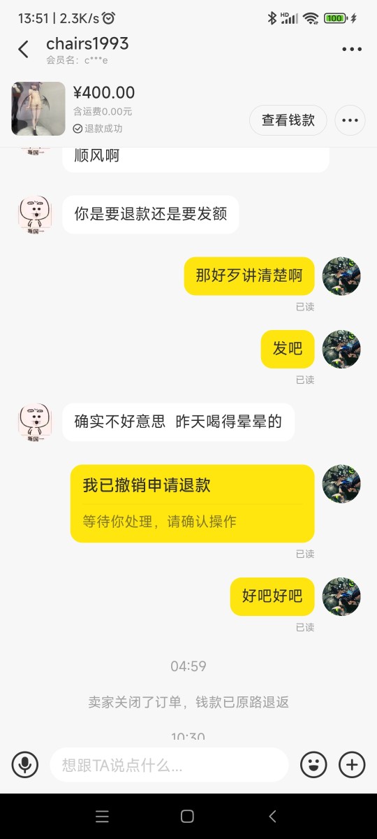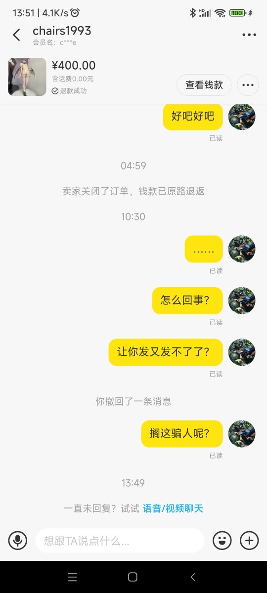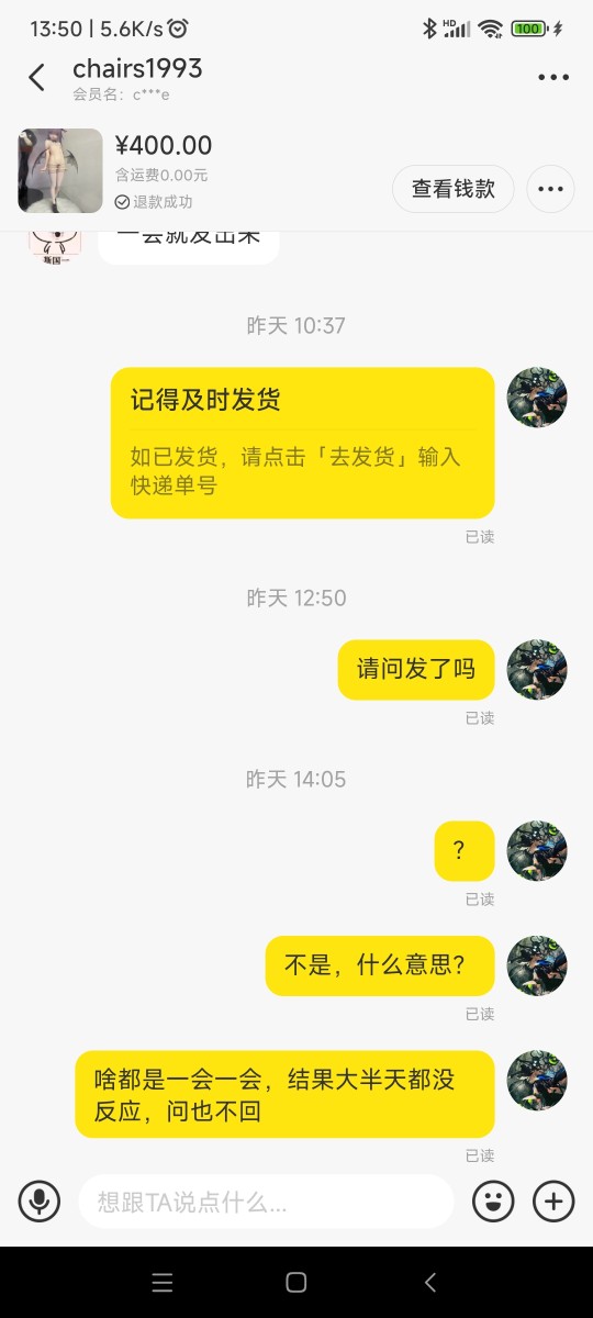 真是没想到有这么恶心的人,又是拖又是已读不回的,最后还莫名其妙把订单取消了,完全不理人了,纯纯的恶心人 大家避一下雷吧