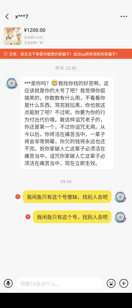 几星期前买手办来谈过,没成交,也没发生什么事。几星期后突然无厘头就发长文来骂,然后今天是第二次还换号了,屁放完就拉黑还不给你回。第一次是成交一两笔的三无小号,第二次是零成交的还是三无小号,就知道同是河北的。h站和闲鱼我都只有一个号,还大号,搞清楚再来好不好。