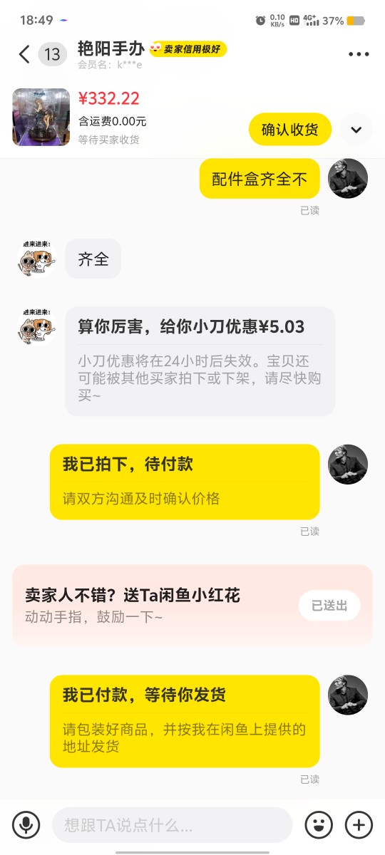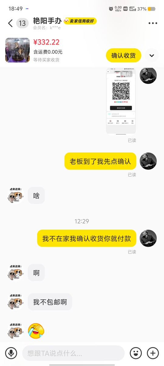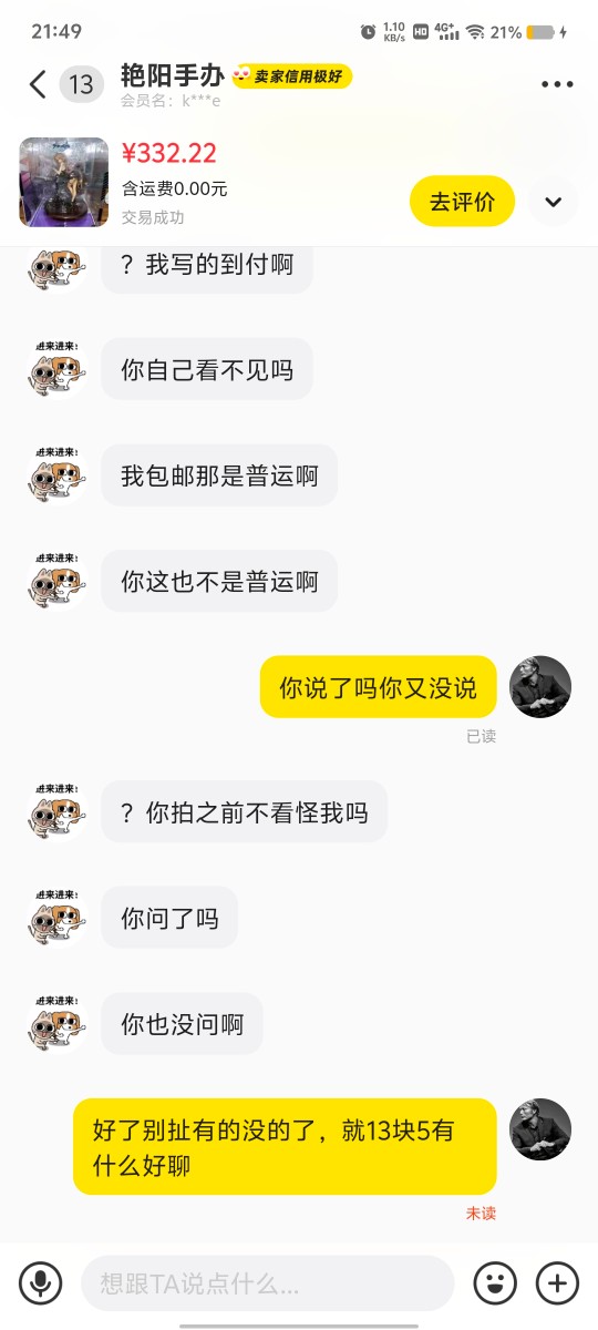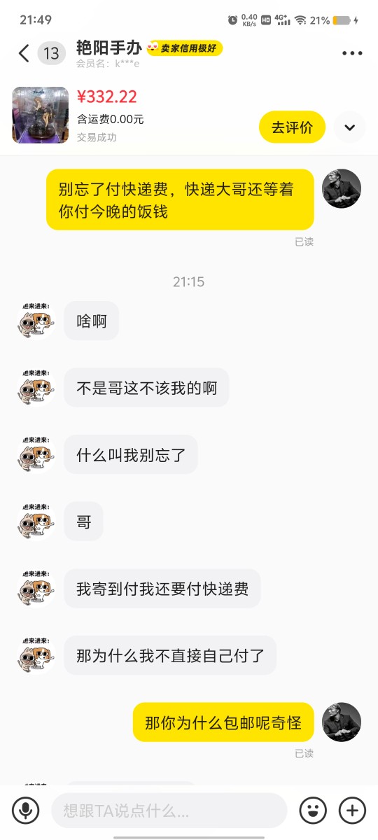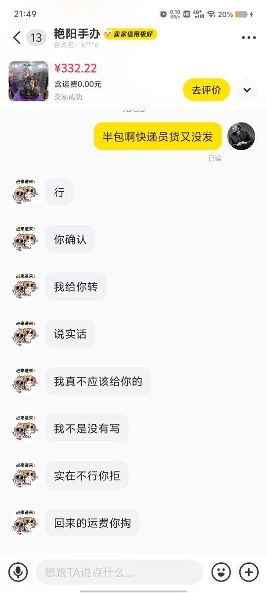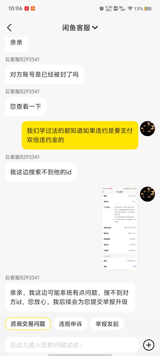 买手办卖家拒付邮费,后续承诺半邮骗我确认收货 。还说我到手刀,我直接确认收货就为了这13块邮费给他到手刀,本身就是标明是包邮的,结果到付想让我出钱。 后面经过沟通协商承诺半包邮,我把钱提前给快递小哥了。后面让我确认收货之后不管。客服说id搜不到呢?看咸鱼的态度是默认这种交易风气的,买家在咸鱼上面很难保障自己应有的权利。 做生意上过学的都知道,违约方是需要支付双倍违约金的。核心价值观至少两个字被他吃了。