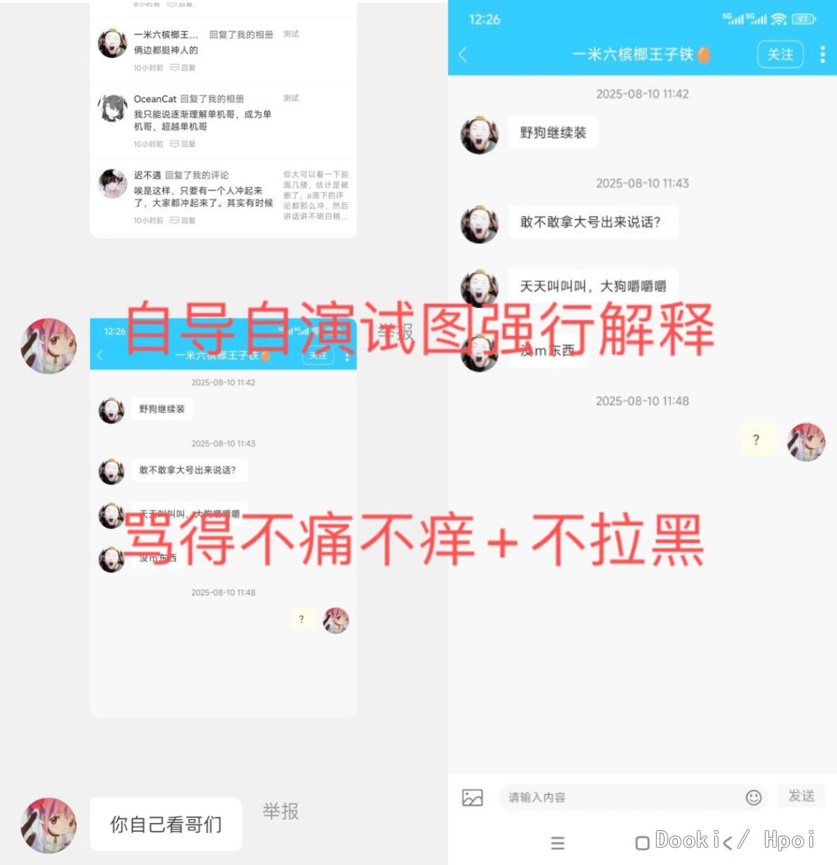 1.经典装理中客各打50大板,然后拉偏架,“寻血猎犬”和“造谣”的帽子扣的一模一样,还有把otaku佬的事搬出来颠倒黑白诋毁别人,就这还想装理中客 2.骂我们那么多人,你们语气措辞一模一样,而且都是先拉黑再单方面输出,唯独不拉黑你?还让你发个问号表现自己无辜?你小号演的像一点好不好 3.骂人风格一模一样:寻血猎犬+造谣等关键词,等级歧视+延期不让喷等同样言论 4.两面三刀,前脚道歉后脚光速变脸“那我骂你没毛病”,底层逻辑:我素质低难道不是你的错?