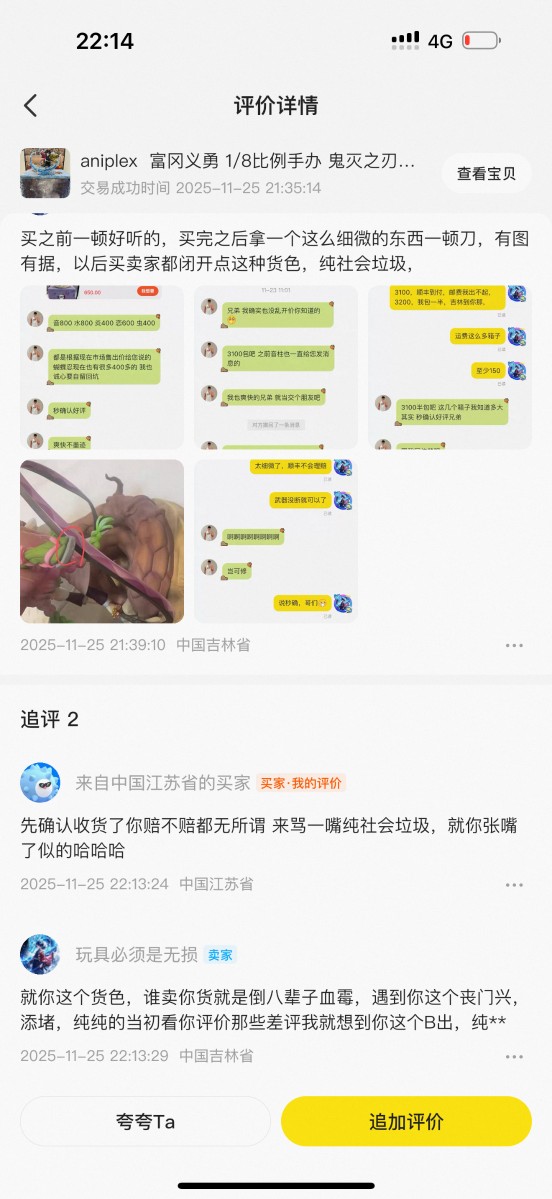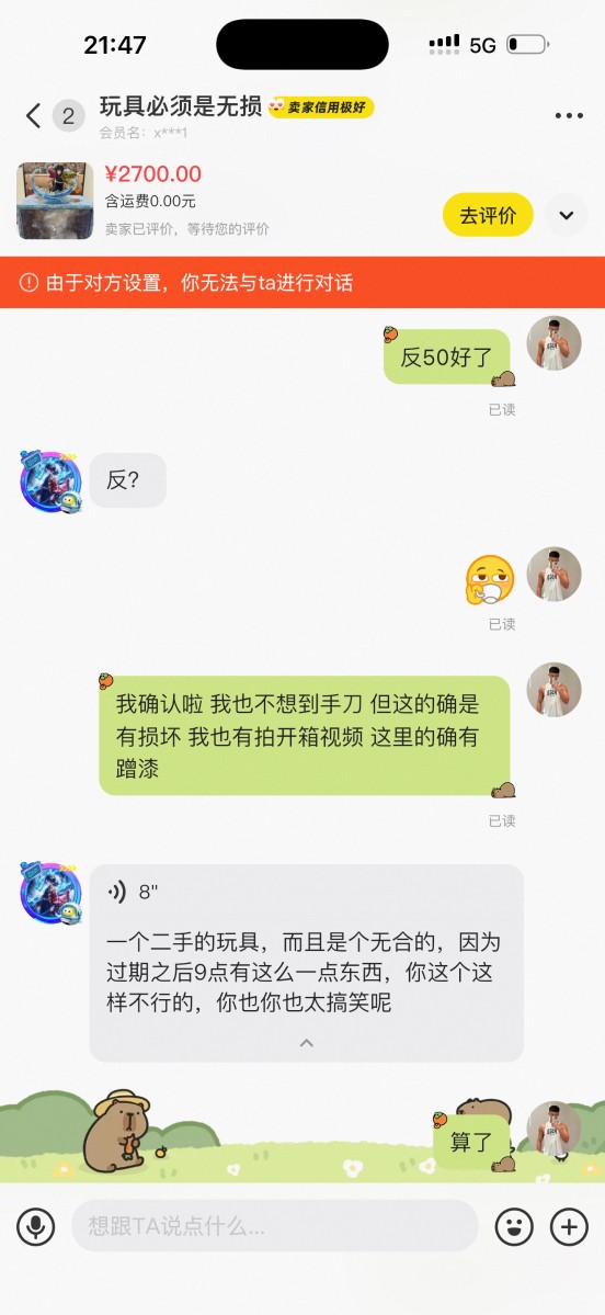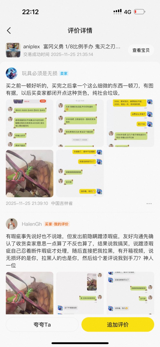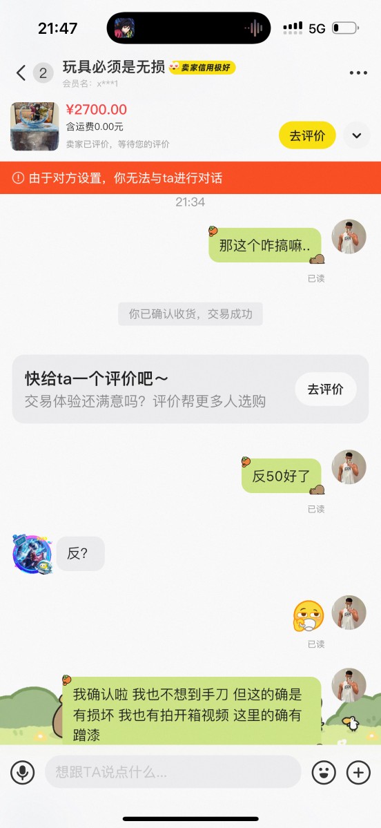 买了东西,故意隐瞒瑕疵,也不走顺丰理赔,我想着算了先确认收货卖家随便意思一点得了,本来也没想到会有瑕疵更没想过刀手刀,结果他反而给我差评拉黑把我骂一顿…自己id玩具必须是无损,发给别人隐瞒瑕疵还给别人说蹭漆瑕疵不管,断件才处理,确实好笑