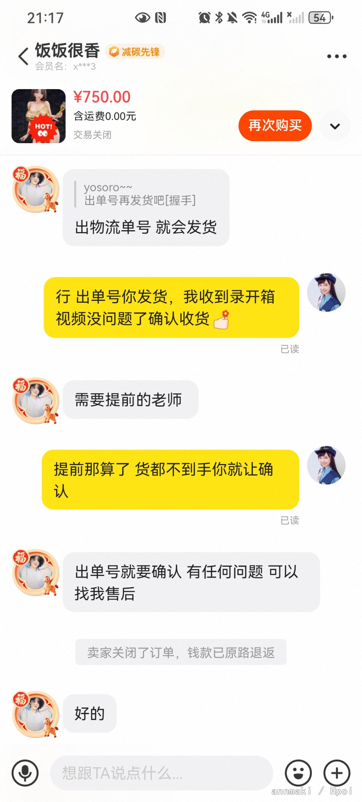 开始还以为是转单,结果说是预定要求提前确认,我要求填单号发货以后又改称出单号就要确认,最后自己关闭订单了。 大家小心不要提前确认,十个里面九个骗,剩下一个也是旁氏骗局指不定哪天就跑路,拒绝提前确认从我做起。