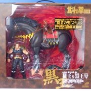 アクションフィギュア 【サイズ】全高 約33cm(乗馬状態) 【パッケージ】ウインドウボックス初回発売:06年12月15日 壮絶!の一言に尽きる!!ついに北斗の拳200Xシリーズにラオウ黒王が再登場。 企画・製作 海洋堂、原型製作 榎木ともひで氏。 不自然に見えない可動ラインと新機軸の可動システム、